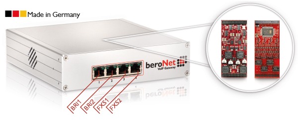 The beroNet FXS & BRI VoIP Gateway (BF4002S02FXSBox) contains 2 BRI (S0) and 2 FXS ports. It connects SIP with ISDN and analog (FXS); ideal for connecting analog devices like telephone, Fax, alarm system, ec cash and modems. The switching of TE or NT mode as well as the terminating resistors for each port is done JumperFree using the beroNet Web GUI. A fax server can also be connected with a virtual CAPI.